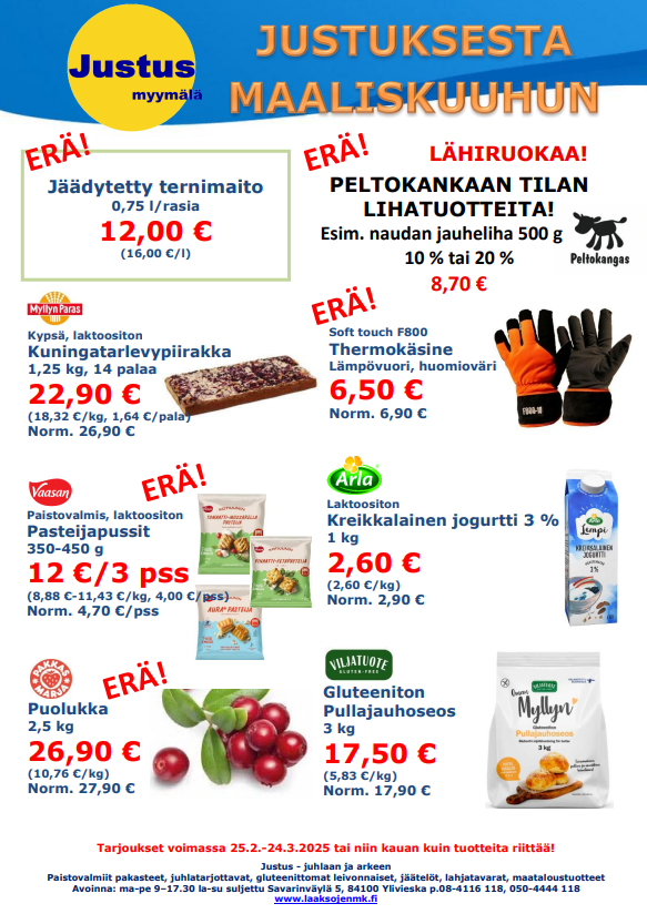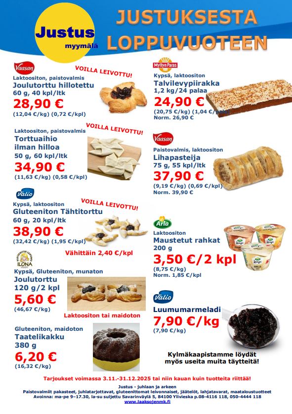 Justus-myymälän suosikkituote ovat vuodesta toiseen ollut paistovalmiit pakasteet, joista loihdit suolaiset ja makeat juhlatarjottavat ja muut kahvileivät helposti ja nopeasti. Tukkupakkauksissa pakasteet ovat edullisia, mutta pakkaamme tarvittaessa myös pienempiin pakkauksiin.